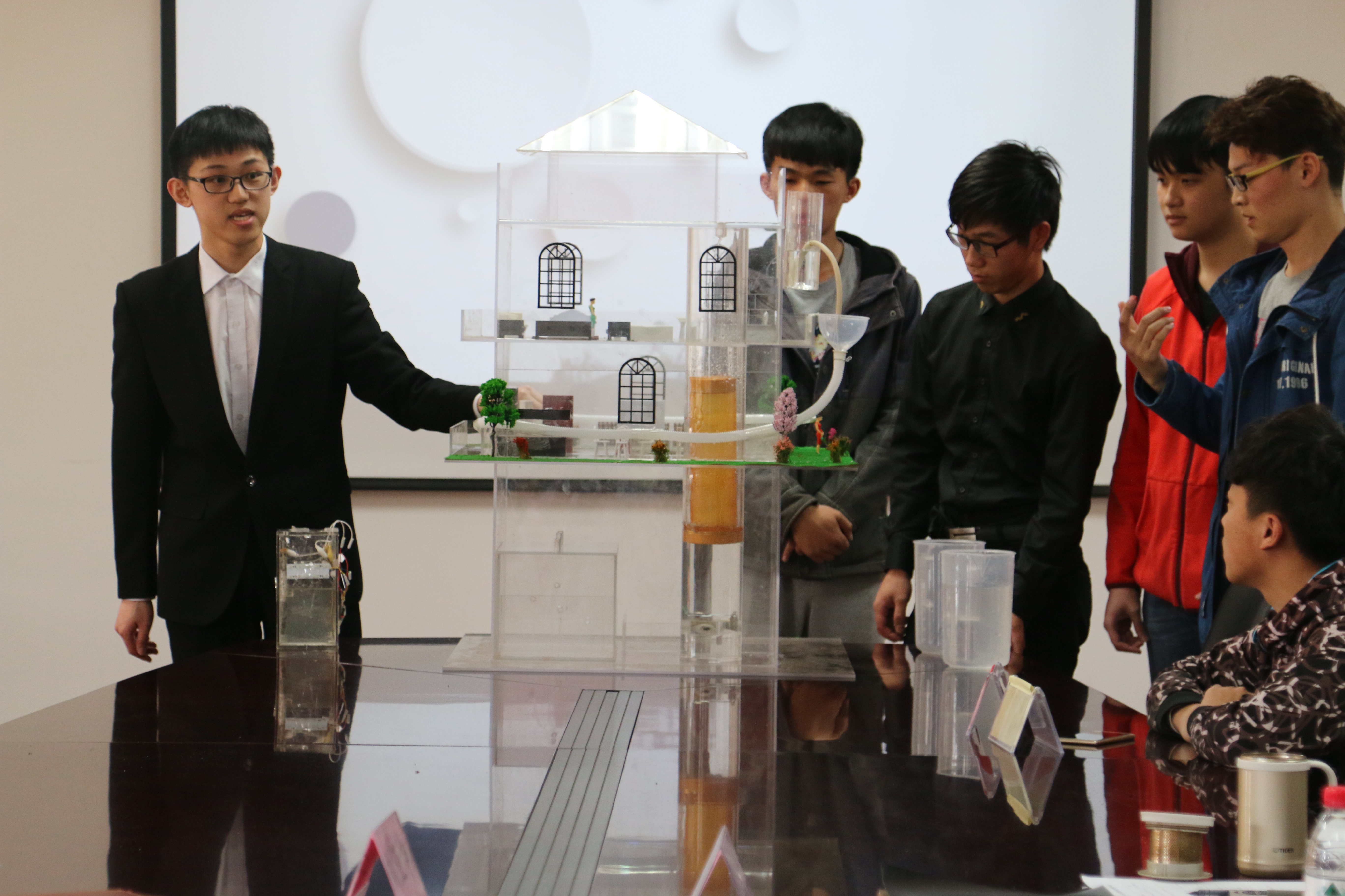 杨广进、谷洋、张宝顺、李泰然、杨颂阳团队作品《以水为媒,打造绿色家园》制作了精细的实物缩小模型,得到了评委一致好评。该作品利用水的浮力制作了水动力浮梯,避开密封性问题;利用水的虹吸作用制作了定时浇花系统;利用水的导电性制作了发电装置提供照明和应急用电;利用水的比热容制作了水幕墙以调节室内气温等?/span>