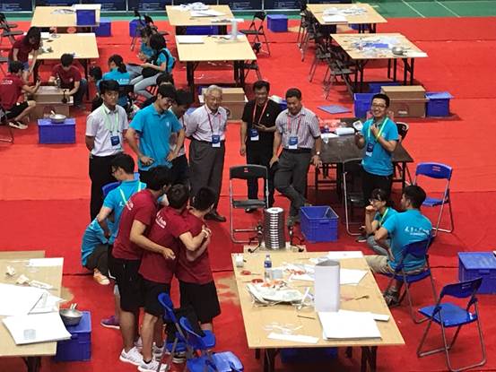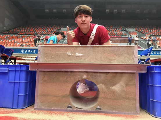 ?/span>7?/span>18日决赛中队员们沉着冷静,发挥出色,制作的模型重量仅389.5g,全场最轻,是场上最重模型的六分之一。填装砂后,侧面看起来十分单薄,被普遍不看好。然而,当最后一片砝码加上后,最大沉降仅?/span>3.56mm,全场仅有四个队沉降小于4mm,得到了在场专家和队员们一致赞许,最终获得一等奖?/span>