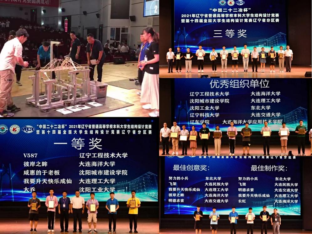 建设工程学部两支参赛代表队分别由2018级本科生吴庆彬、邢增良、杨雨霄?020级本科生王逸凡、王茹阳、王天厚组成,分别设计两架承受变参数荷载的不同结构桥梁。在陈廷国、檀永刚、崔瑶、唐玉、付兴等教师指导下,经过四天的现场激烈角逐,从辽宁省25所高校的参赛队伍中脱颖而出,获辽宁省普通高等学校本科大学生结构设计竞赛一等奖1项、三等奖1项,一等奖获奖队伍同时获最佳创意奖、最佳制作奖,我校获优秀组织单位奖?/p>