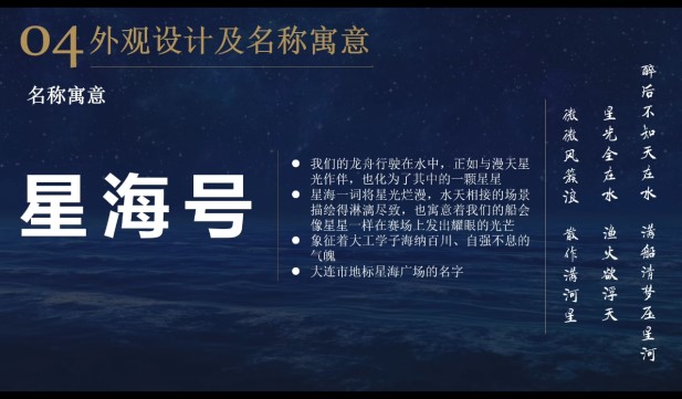 “凌波逐浪”,“凌波”意味步履轻盈,如乘碧波而行;“逐浪”展现大工学子不畏艰难险阻、勇敢追逐梦想的奋斗精神,表达队员们一举夺冠的决心。“夜空深邃、碎星如尘,“星海”蕴含了队员们不惧挑战、勇争上游,追逐星辰大海的决心。两艘龙舟最终都不负众望,在本次比赛中斩获佳绩,充分展现大工风采?/p>