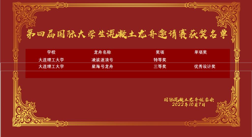 2022?0?日,第四届国际大学生混凝土龙舟邀请赛(ICDBC-2022)落下帷幕!由建设工程学部吕兴军、李冬生老师指导,船舶工程学院孙雷和电信学部陈景老师担任顾问,来自建工、电信的10名本科生组成的两支队伍团结协作、披荆斩棘,斩获特等奖(第一名)和三等奖?/p>